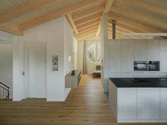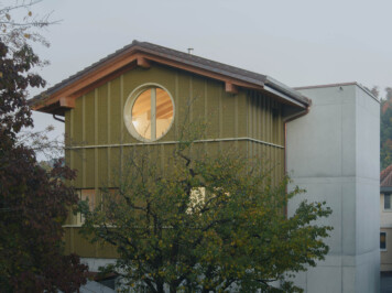 Architektur und BaumanagementIm Zuge des Generationenwechsels wurde die ehemalige Produktionshalle durch einen Neubau ersetzt. Der Entwurf des Wohnhauses orientiert sich an den Grundmassen des ehemaligen Industriegebäudes und fügt sich harmonisch in die Nachbarschaft sowie den üppigen Baumbestand ein. Lediglich das Treppenhaus ist südseitig an das dreigeschossige Gebäudevolumen angebaut.