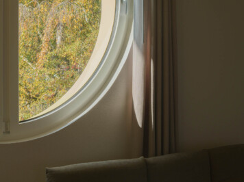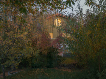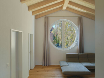Das Wohnhaus präsentiert sich mit einer zurückhaltenden und zugleich selbstbewussten Fassade, die sich nahtlos in die bestehende Typologie der Umgebung einfügt. Die Materialwahl ist schlicht und bietet dennoch Raum für die Liebe zum Detail – Holz und Beton treffen aufeinander. Das Sockelgeschoss aus Sichtbeton und der angebaute Treppenkern betonen die funktionale Nutzung des Gebäudes. Die beiden Wohngeschosse sind in strukturierter Holzschalung ausgeführt und mit einer grünen Lasur versehen, die das Gebäude harmonisch in den natürlichen Kontext integriert und es zu einem organischen Teil der Umgebung macht.